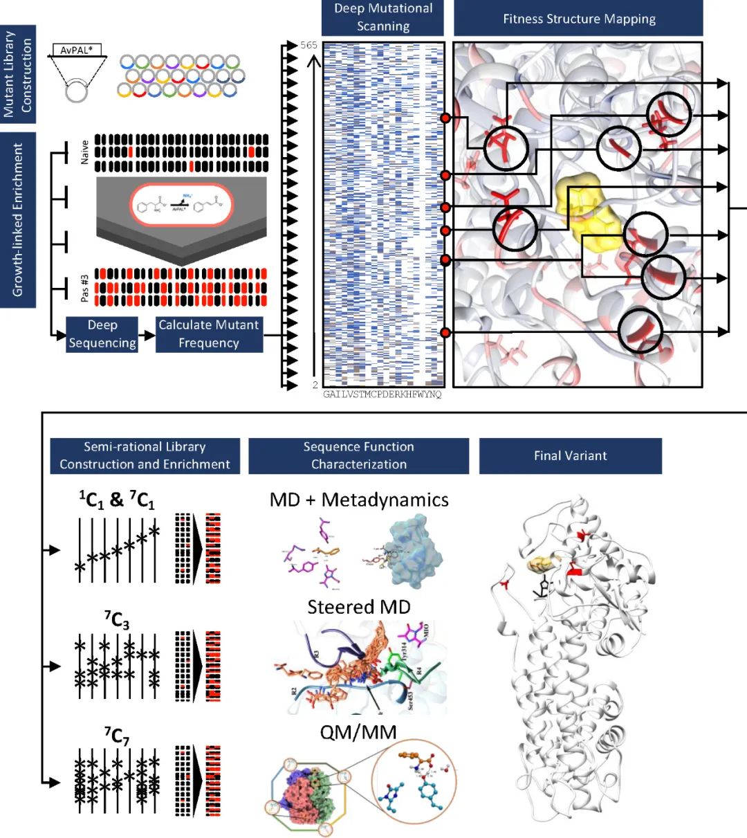 深度突變掃描 (Deep mutational scanning, DMS)已成為評估序列-功能關(guān)系、識別功能熱點、并加速和/或擴(kuò)大工程活動的強(qiáng)大方法。它可以提供全面的序列-功能關(guān)系圖以探索蛋白質(zhì)適應(yīng)度景觀、發(fā)現(xiàn)新的功能相關(guān)位點以及確定蛋白質(zhì)工程的有益突變組合。本文作者開發(fā)了一種工作流程來設(shè)計苯丙氨酸解氨酶(PAL),并進(jìn)一步評估特定突變?nèi)绾慰朔呋^程中限制活性的不同步驟,整體流程如圖1所示。