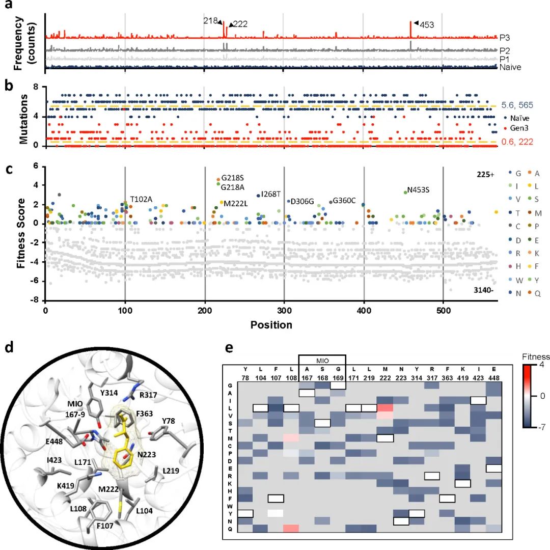 該團(tuán)隊此前開發(fā)了一種生長偶聯(lián)富集技術(shù),用于在大腸桿菌中快速篩選AvPAL的高活性變體。原理是高活性AvPAL變體可以更快地催化Phe脫氨生成NH4+,從而促進(jìn)大腸桿菌的生長?;诖思夹g(shù),作者對AvPAL進(jìn)行隨機(jī)突變獲得了Naive文庫,并傳代富集了3次。然后使用高通量篩選方法對AvPAL進(jìn)行DMS,獲得其詳細(xì)序列-功能圖譜(圖2)。在第3代的突變體文庫中,218、222和453位點的突變高度富集(圖2a)。Naive文庫每個基因包含大約2-4個氨基酸突變,突變分布廣泛(565個殘基),每個殘基平均有5.6個替換。而第3代中只有222個位置有突變,且平均只有0.6個突變(圖2b)。負(fù)適應(yīng)度(灰色)指的是在傳代過程中出現(xiàn)頻率下降的突變,而適應(yīng)度最高的“熱點”T102、G218、M222L、I268、D306、G360、N453被用于后續(xù)研究(圖2c)。通過對比,作者發(fā)現(xiàn)適應(yīng)度得分與酶的催化活性具有很高的相關(guān)性。