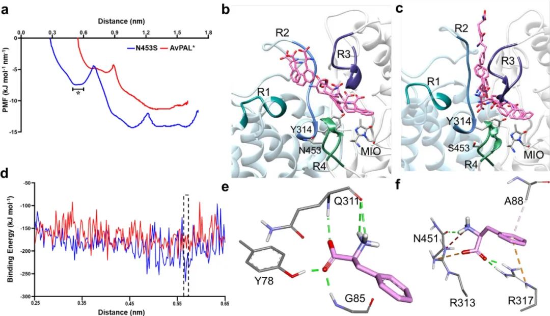 由于N453S位于活性位點外圍,作者認(rèn)為它可能會影響底物Phe的結(jié)合過程。因此,對AvPAL和突變體進(jìn)行導(dǎo)向分子動力學(xué)(SMD)以研究Phe從活性位點離開蛋白質(zhì)期間的能量變化與涉及到的相關(guān)殘基。平均力勢(PMF)圖顯示N453S有兩個最小值,而在AvPAL中沒有觀察到(圖6a)。從傘形采樣中提取Phe的構(gòu)象變化,并映射到AvPAL和N453S的結(jié)構(gòu)上(圖 6b和c)。對于AvPAL,通向活性位點的路徑很窄,導(dǎo)致進(jìn)入受限且在能量上不利。N453S的路徑更寬,能量更有利,底物呈現(xiàn)良好的構(gòu)象。