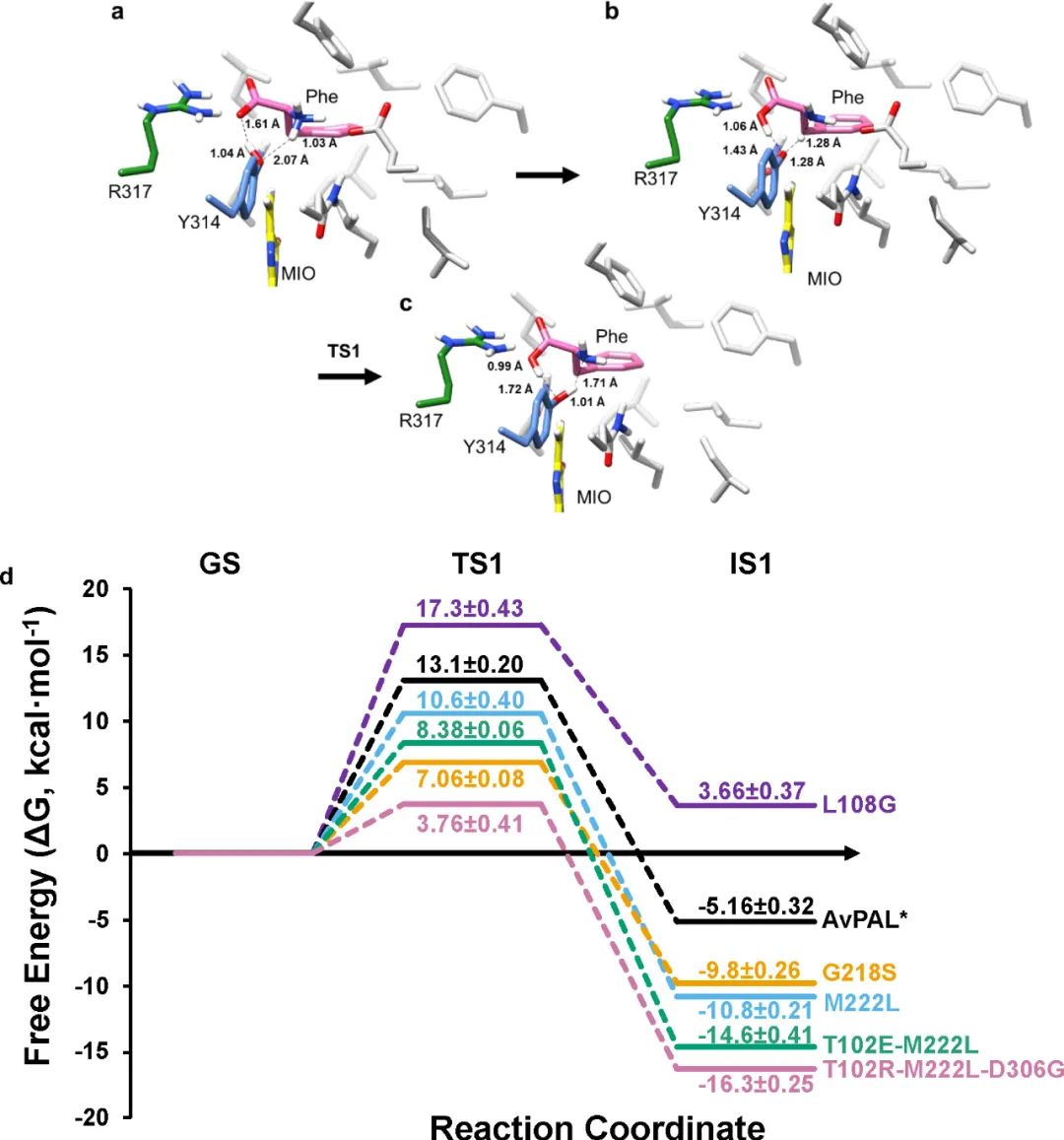 基于此前對PAL反應(yīng)機(jī)制的研究,作者通過QM/MM模擬提出了AvPAL的反應(yīng)機(jī)理(圖8a-c),并計算出了總相對自由能圖(圖8d)。對比TS1和IS1的能量可以看出L108G < AvPAL< M222L < G218S<T102EM222L < T102R-M222L-D306G,符合實驗結(jié)果。