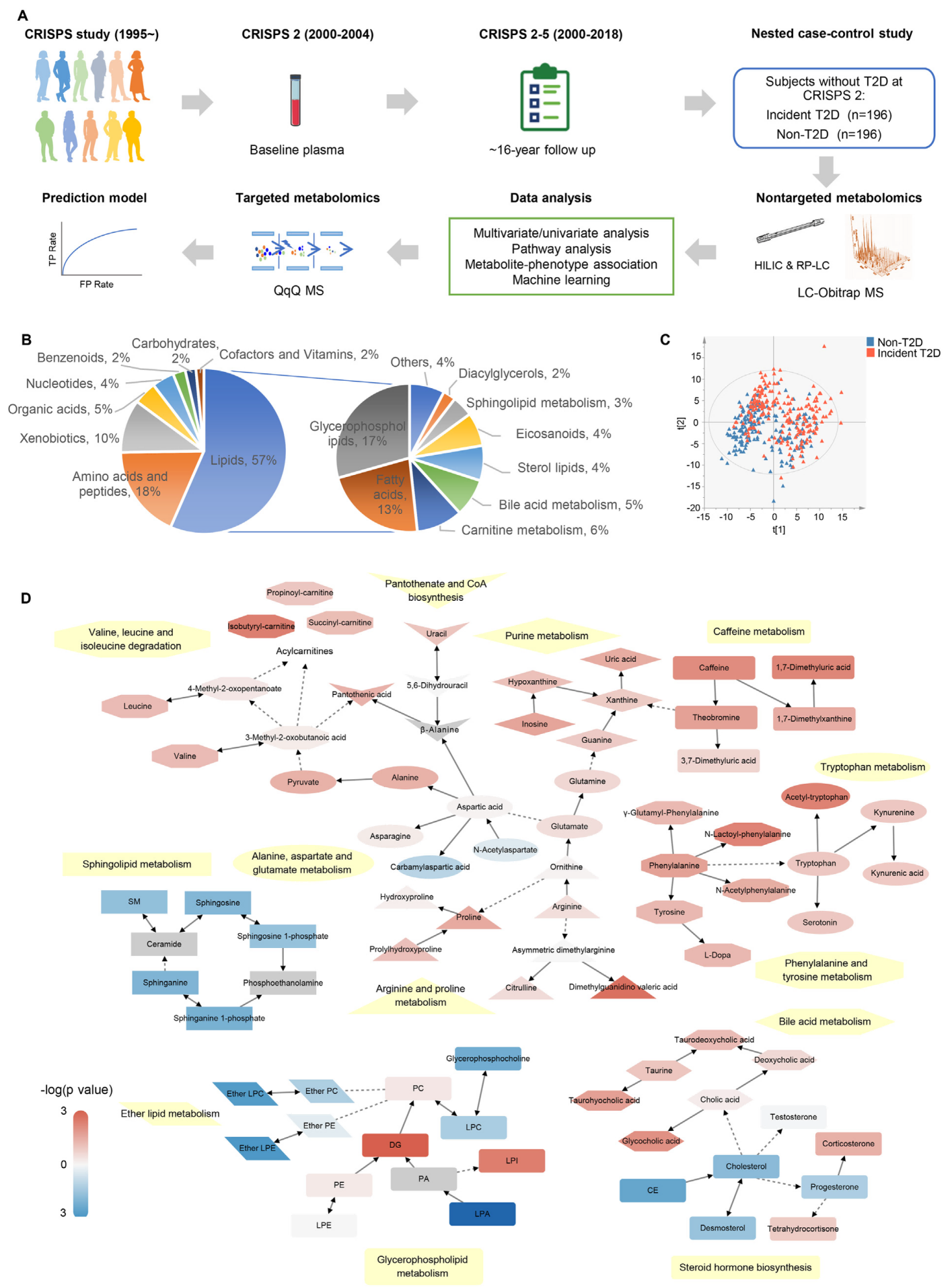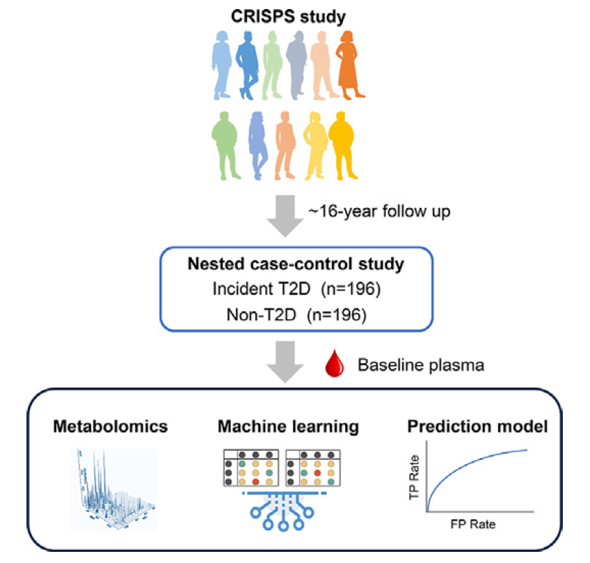 對(duì)香港心血管危險(xiǎn)因素患病率研究(CRISPS)隊(duì)列參與者(來自196例T2D患者和196名年齡和性別匹配的非T2D對(duì)照者)的血漿樣本進(jìn)行代謝物檢測(cè)和差異分析;