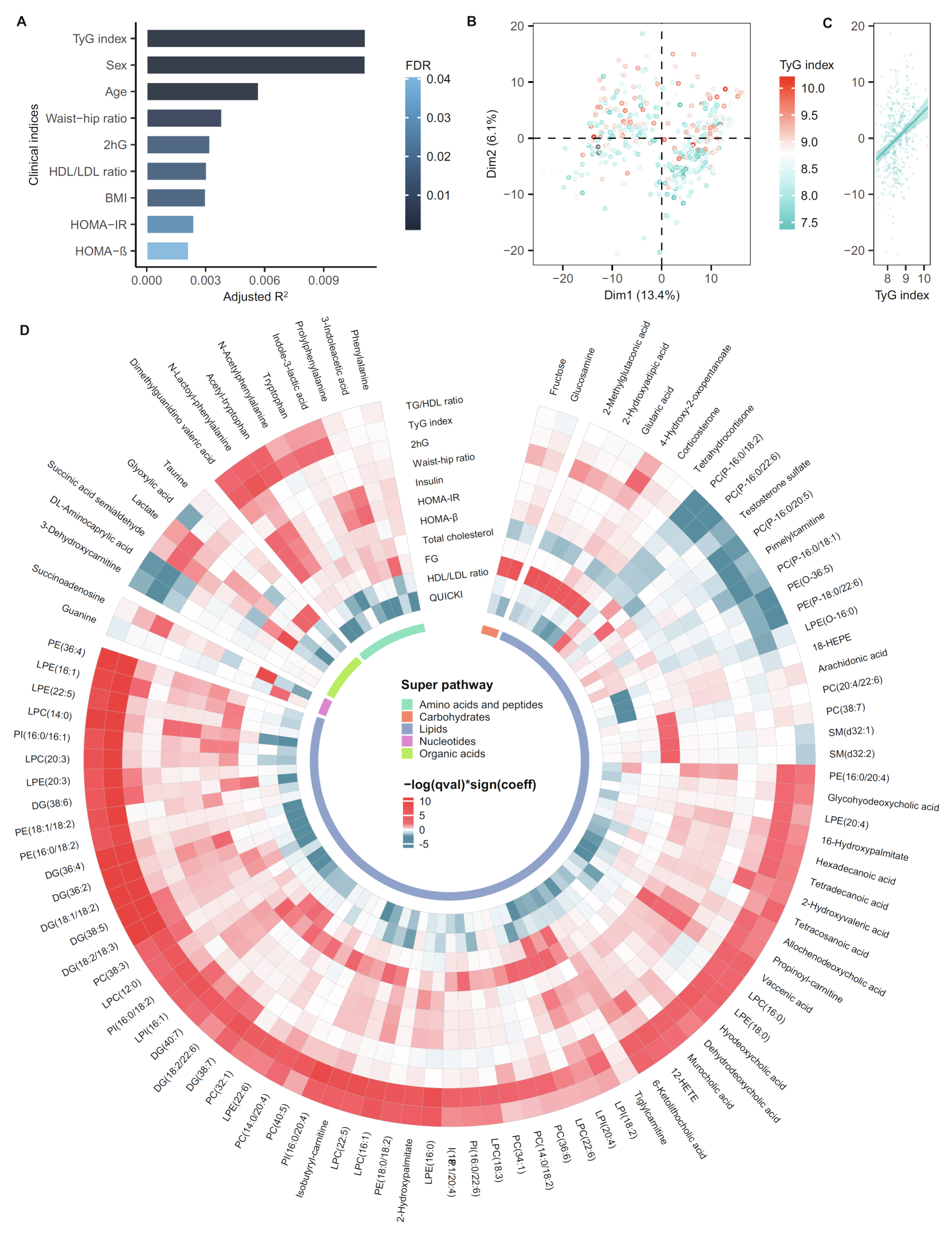 代謝變化與臨床參數(shù)之間的獨(dú)立相關(guān)性代謝變化與臨床參數(shù)之間的相關(guān)性分析表明,胰島素抵抗(TyG指數(shù))解釋了大多數(shù)觀察到的代謝變化(圖3A),表明這些變化與胰島素抵抗而非b細(xì)胞功能障礙(HOMA-b)更密切相關(guān)。與HOMA-IR相比,TyG指數(shù)對(duì)代謝變化的貢獻(xiàn)更大(圖3B-C)。