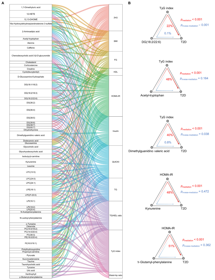 通過分析代謝產(chǎn)物對(duì)臨床危險(xiǎn)因素介導(dǎo)的T2D事件的貢獻(xiàn),共建立了457個(gè)中介聯(lián)系,這些中介聯(lián)系主要由TyG指數(shù)、TG、TG/HDL比值、HDL、腰臀比、QUICKI和HOMAIR介導(dǎo),20.6%的中介聯(lián)系是控制胰島素抵抗(TyG指數(shù)和HOMA-IR),10.3%是通過胰島素敏感性(QUICKI)。特別地,TyG指數(shù)介導(dǎo)DG(18:2/22-6)、乙酰色氨酸和二甲基胍戊酸對(duì)T2D的影響分別為22%、48%和40%(圖5B)。這些觀察結(jié)果表明,代謝產(chǎn)物和危險(xiǎn)因素可能導(dǎo)致T2D事件。